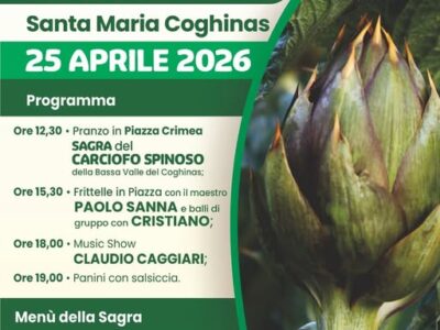 La sagra del carciofo festeggia i diciotto anni dalla prima edizione Nonostante il maltempo abbia compromesso la raccolta e la produttività dei campi della Bassa valle del Coghinas, Santa Maria Coghinas non mancherà al prossimo appuntamento con la Sagra del carciofo, organizzata dalla Proloco con l’immancabile e generosa presenza degli imprenditori e della Cooperativa del Coghinas. Quest’anno l’appuntamento con l’eccellenza, sua maestà il carciofo spinoso, diventa maggiorenne; nel 2008 il